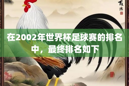 在2002年世界杯足球赛中,经过激烈的角逐,最终排名已经确定。各国队伍为了荣誉和胜利奋力拼搏,展现出精湛的球技和团队合作精神。经过层层选拔和比拼,最终排名揭晓,各国队伍的名次各有千秋。这场比赛不仅展现了足球运动员的才华和技艺,也展现了足球运动的魅力和激情。