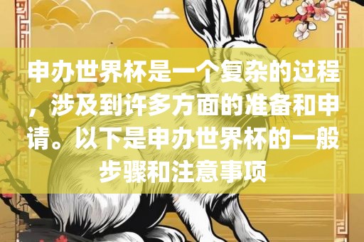 申办世界杯是一个复杂的过程,涉及到许多方面的准备和申请。以下是申办世界杯的一般步骤和注意事项
