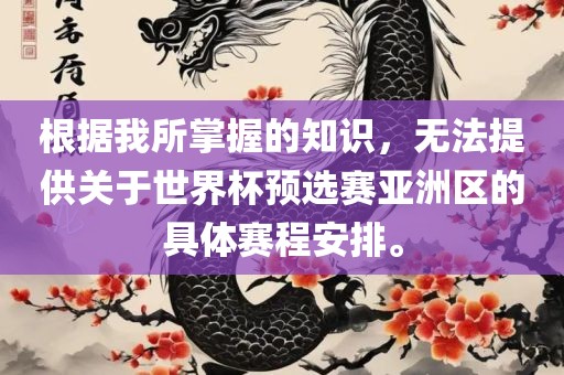 摘要:本文无法提供关于世界杯预选赛亚洲区的具体赛程安排,因为所掌握的信息不足。需要关注相关官方渠道或媒体报道以获取最新赛程安排。