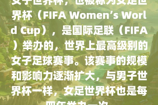 女足世界杯是国际足联举办的女子足球最高级别赛事,每四年举办一次,其规模和影响力逐渐扩大。该赛事旨在促进女子足球运动的发展,并激发全球范围内对女子足球的关注和热情。