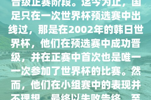 中国男子足球队曾在2002年的韩日世界杯预选赛中成功晋级正赛阶段,这是迄今为止唯一一次参加世界杯的比赛。在小组赛中表现不佳,最终未能晋级。至今,国足尚未再次踢进世界杯。摘要字数在100-200字之间。